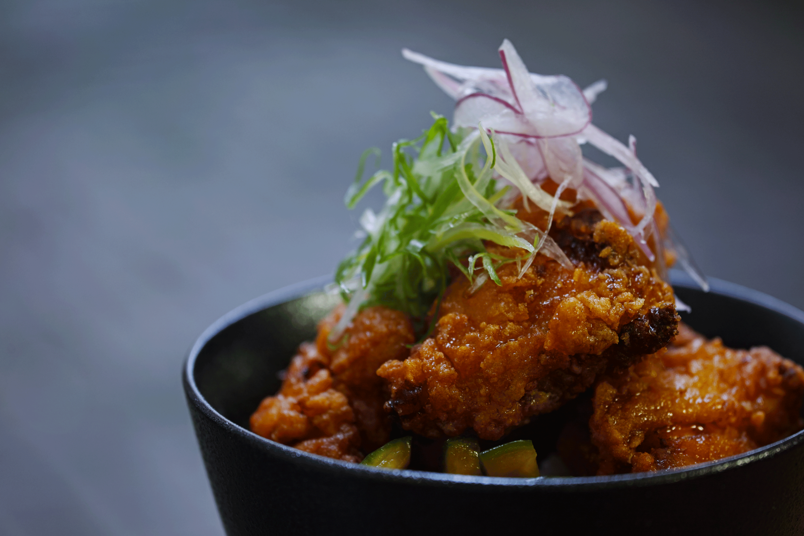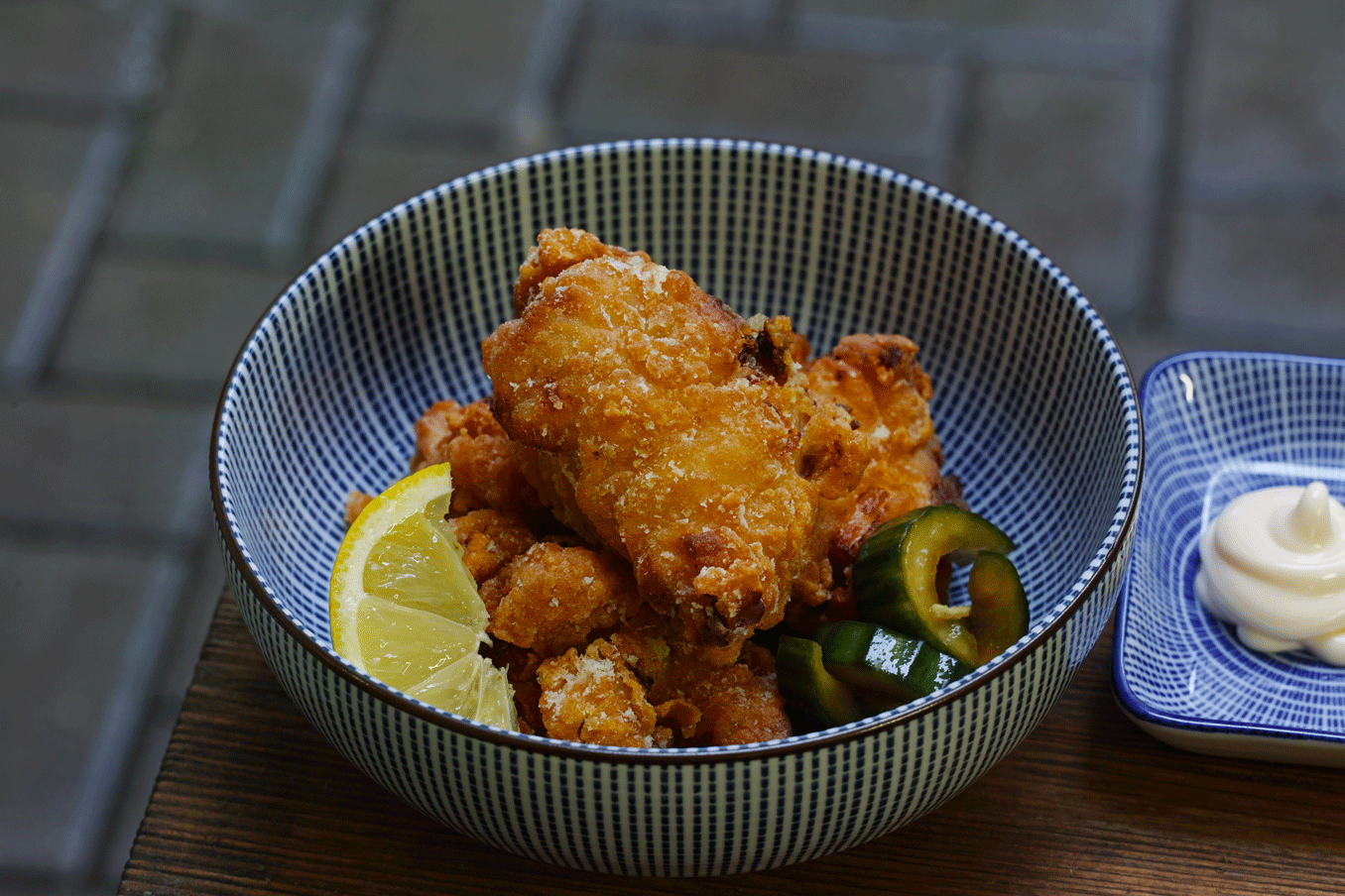 Japanese fried chicken marinated in a homemade soy-based  sauce served with a fresh salad, pickled cucumber and side of japanese mayonnaise