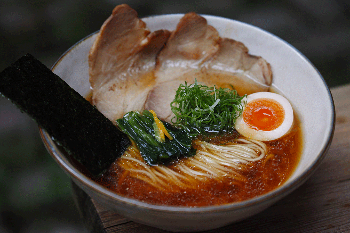 topping: chashu (pork shoulder / chicken breast), half seasoned egg, spring onions, spinach ohitashi, nori, yuzu peel, yuzu oil